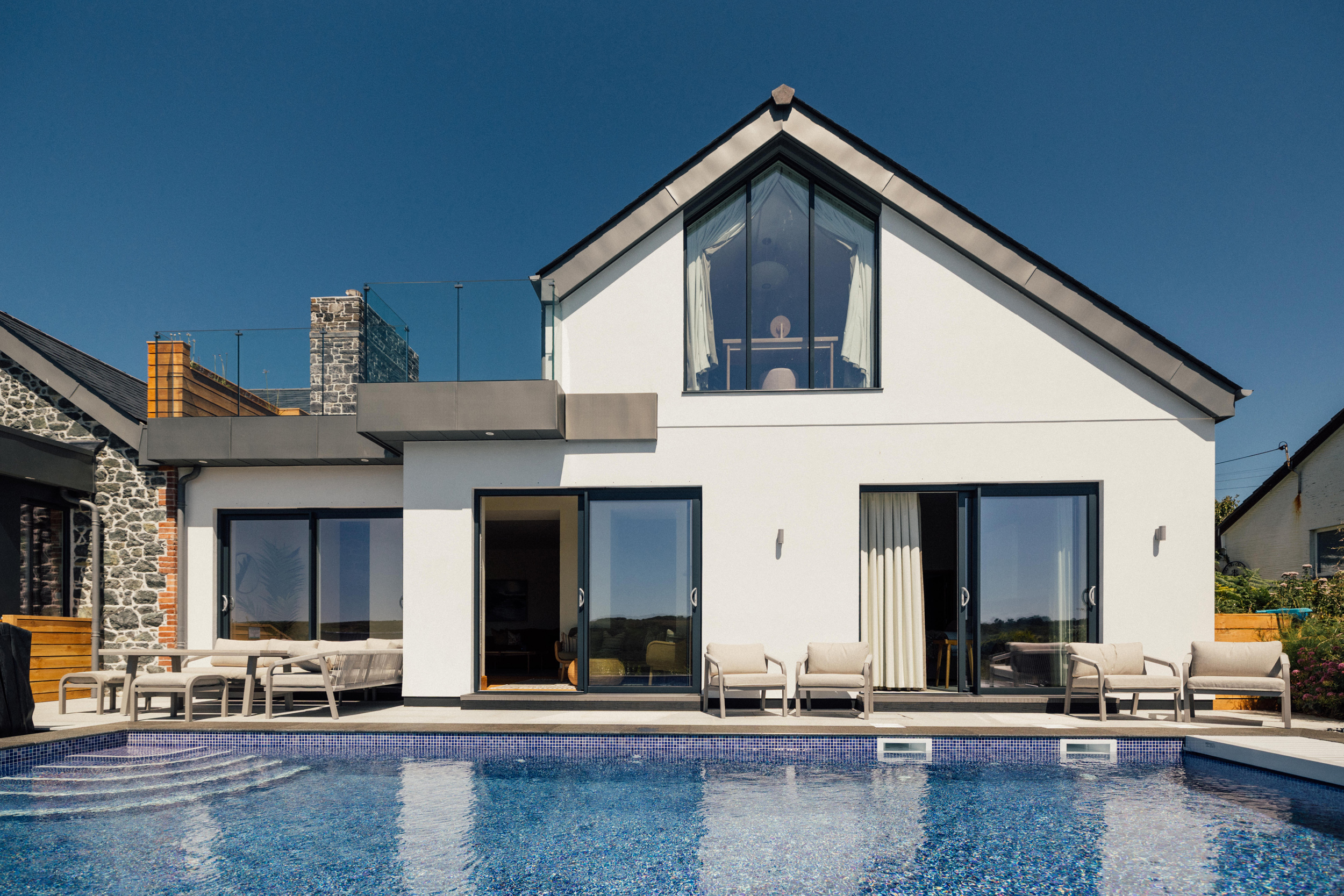Four bedrooms: 1 x super-king-size with with sofa bed, TV, balcony with decking and furniture and en-suite with bath, walk-in shower, heated towel rail, basin, and WC, 1 x king-size (zip/link, can be twin on request) with TV and en-suite with walk-in shower, basin, and WC, 2 x king-size (zip/link, can be twin on request) with en-suite with walk-in shower, basin, and WC. Cloakroom with basin and WC. Kitchen/diner. Sitting room