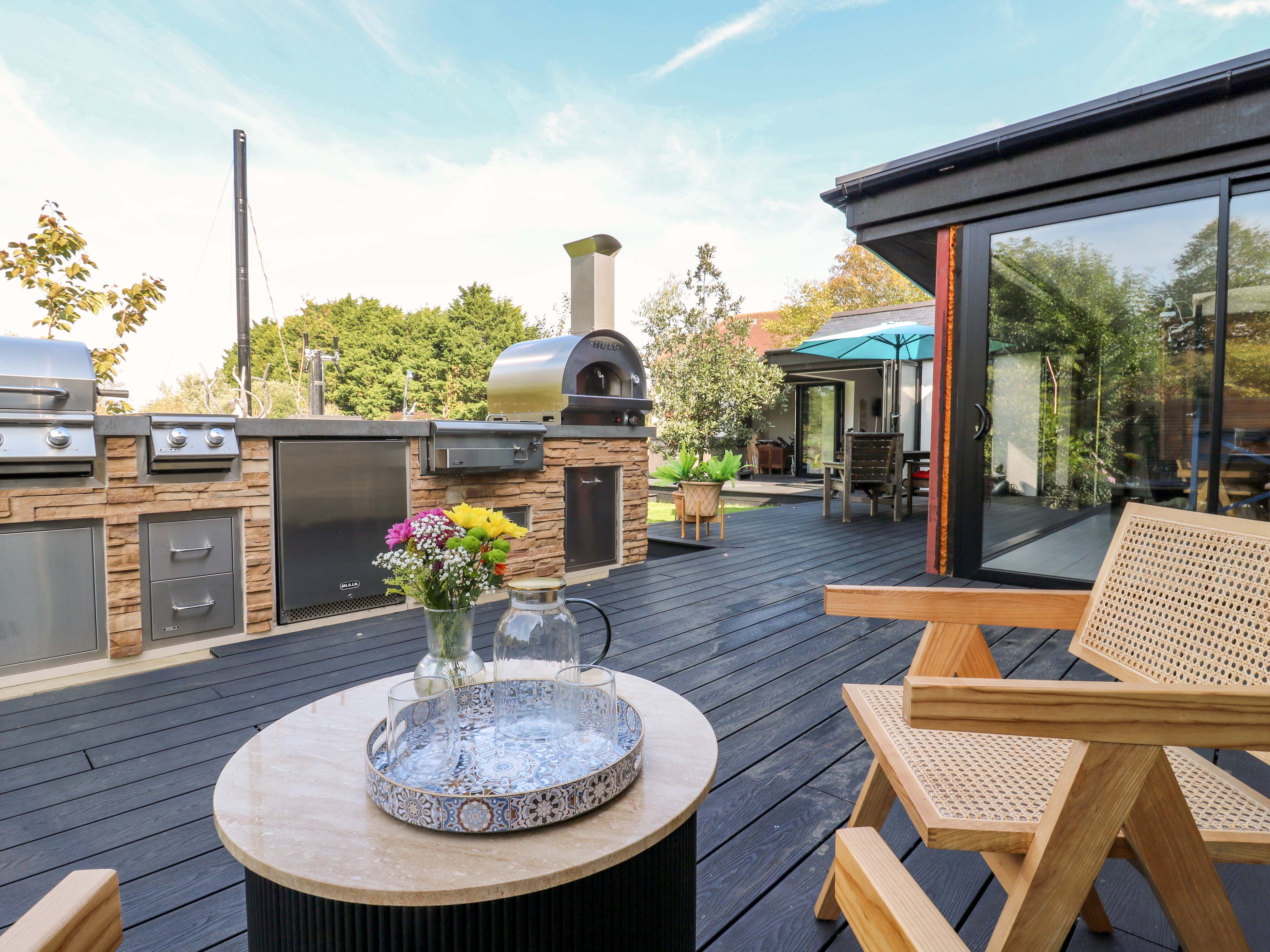 Central heating. Portable aircon unit. Electric double oven, electric hob, oven, hob, microwave, 2 x fridge/freezer, dishwasher, washing machine and tumble dryer. Smart TV, WiFi. Fuel and power inc. in rent. Bed linen and towels inc. in rent. Private driveway parking for 3 cars. Enclosed rear garden with decking, furniture, lawn, pizza oven, bar, beer tap, barbecue, hot tub, sauna and trampoline. One well-behaved pet welcome. Sorry, no smoking. Shop 2.4 miles, pub 2 miles, lake 0.7 miles, river 0.2 miles. Note: Annex connected by a corridor. Note: Pets must stay on the ground floor