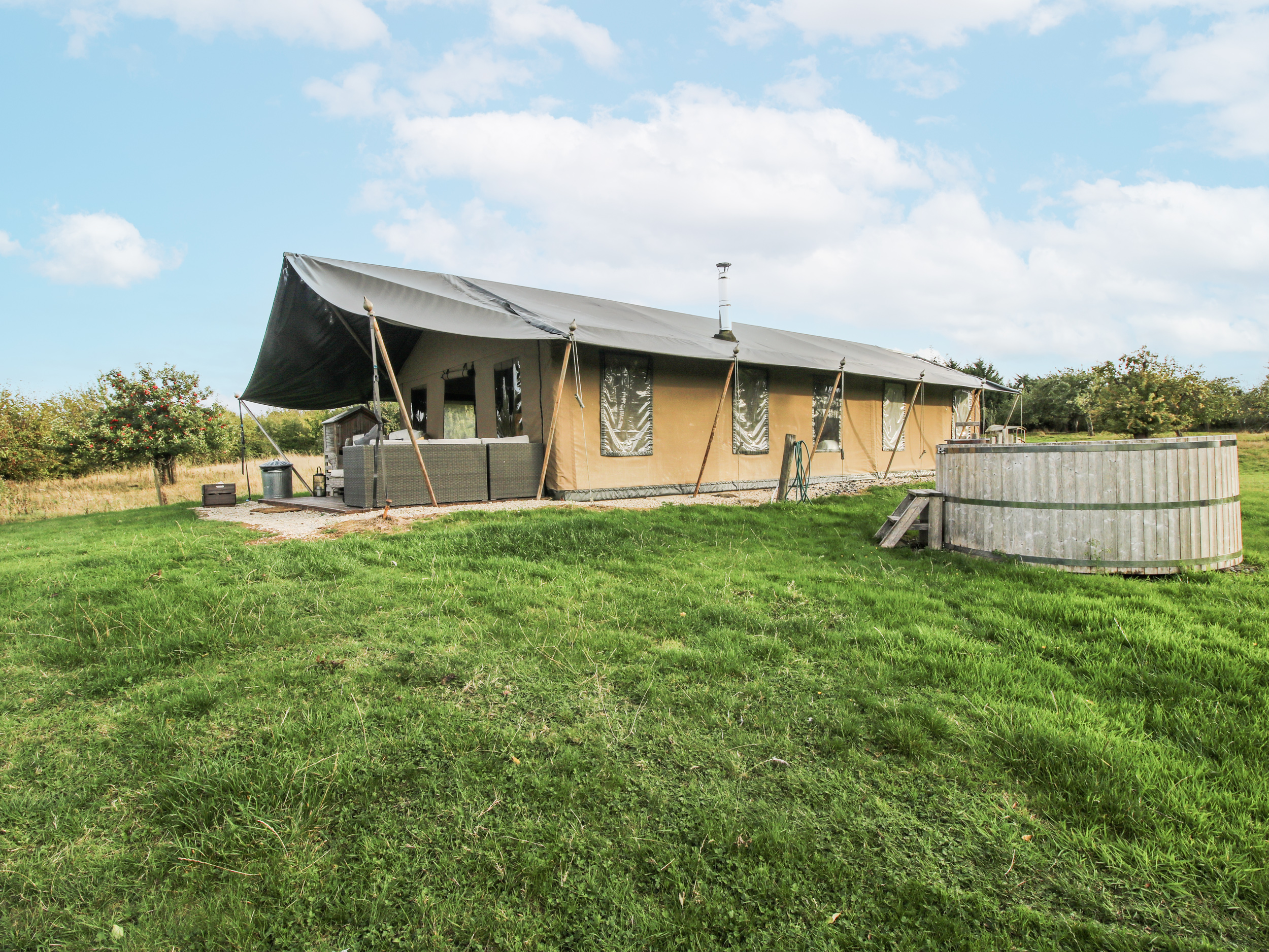 Pear Trees, a single-storey off-grid safari tent, consists of a kitchen with wood-burning range cooker, kettle and a living/dining room with two sofas and dining seating for 8. There is a woodburner (logs, kindling and flamer starter pack) and the bedrooms consist of a king-size, double, and family room. There is a bathroom with bath, basin, and WC. WiFi, fuel, bed linen, and towels are included in the rent. Outside, there is an enclosed rear garden decking with lawn, furniture, barbecue and hot tub and off-road parking for three cars. Two well-behaved dogs are welcome. Sorry, no smoking. Whatever the weather, a wonderful stay awaits at Pear Trees. Note: Additional Extras: Hot Tub £150 per stay, Big Green Egg BBQ with charcoal & utensils: £40 per stay, extra towel bundles: £20. Note: Early or Late checkout: £50. Note: No WiFi in this property. Note: Motorbikes are not allowed on the farm.. Note: Personal barbecues are permitted but must be raised off the ground and attended by an adult at all times. Note: No electric or gas barbecues allowed. Note: If making a fire, the fuel, logs and coal have to be purchased on site. Note: This property requires a Good Housekeeping Bond of £200